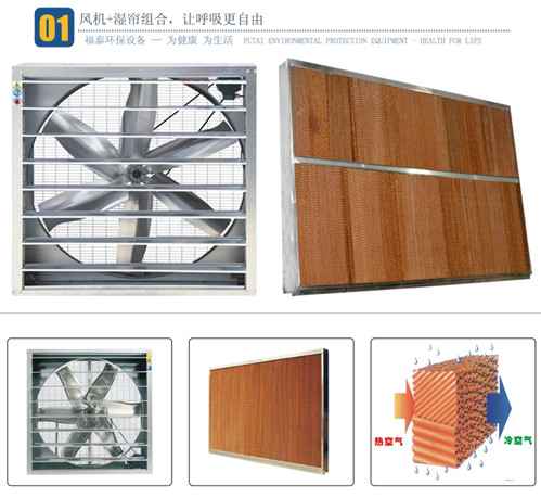 濕簾裝在密閉房舍一端山墻或側(cè)墻上,風(fēng)機(jī)裝在另一端山墻或側(cè)墻上,降溫風(fēng)機(jī)抽出室內(nèi)空氣,產(chǎn)生負(fù)壓迫使室外的空氣流經(jīng)多孔濕潤濕簾表面時,使空氣中大量熱量進(jìn)行轉(zhuǎn)化處理從而迫使進(jìn)入室內(nèi)的空氣降低10-15℃,并不斷的引入室內(nèi)進(jìn)行防暑降溫。